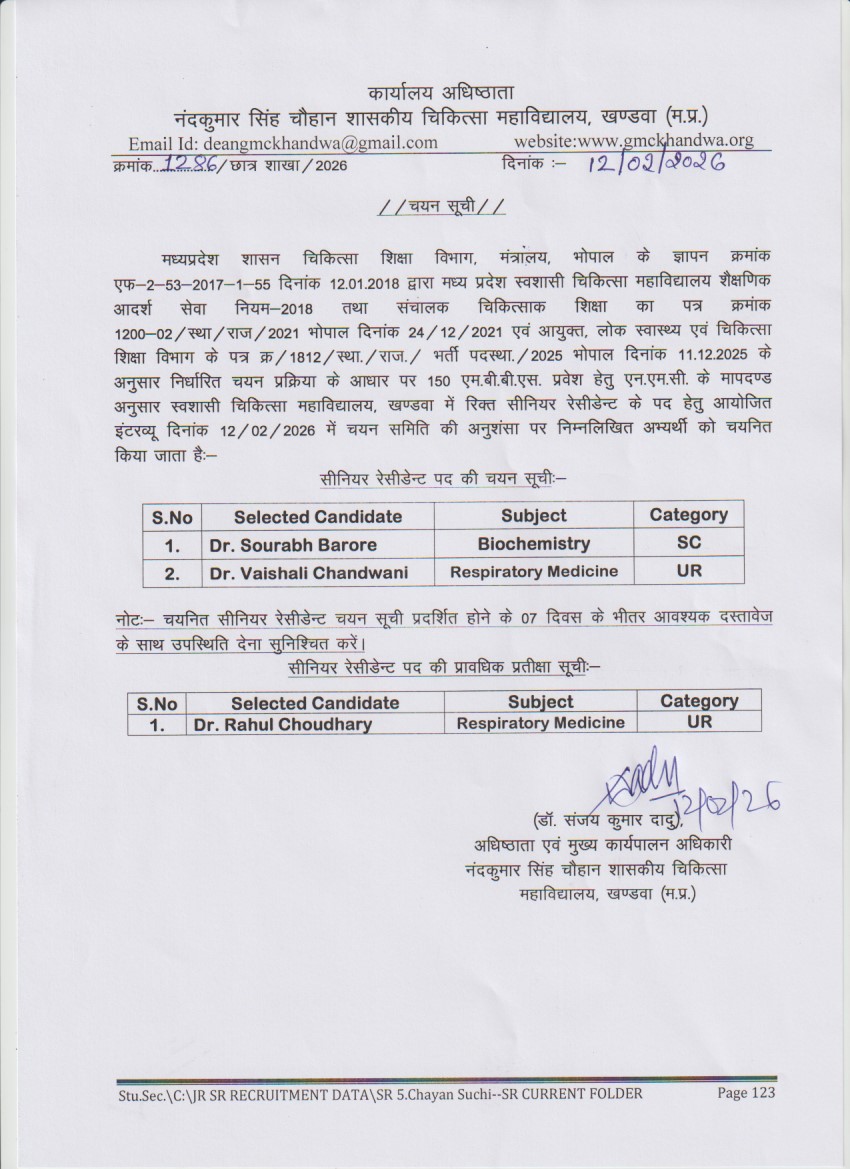 विज्ञप्ति सीनियर रेसीडेन्ट (SR) सुंदरलाल पटवा शा. चि. महाविद्यालय, मंदसौर | 11-07-2024